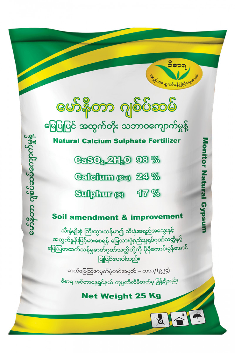 | Description | -It is the natural gypsum power which can modify the soil structure. - It consists of Calcium 24% and Sulphur 17% by the international standard. -It encourages the roots to take up the nutrients. - It can repair the soil salinity. -It can repair iron toxicity in paddy fields when using with potash. -Improve the oil yielding in groundnut. -You can spray it as foliar because it is easily soluble in water. |