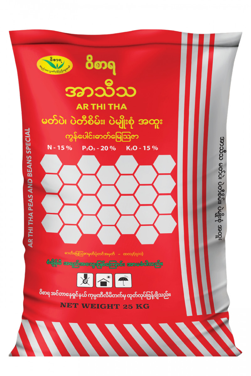 | အာနိသင်ဖော်ပြချက် | -မြေအမျိုးအစားမရွေး၊ ရာသီဥတုမရွေး အသုံးပြုနိုင်သော အရည်အသွေးဖြင့် ဓာတ်မြေဩဇာ ဖြစ်ပါသည်။ -ပဲမျိုးစုံ နှင့် နှံစားသီးနှံများအတွက် အထူးထုတ်လုပ်ထားသော အချိုးမှန်ကွန်ပေါင်းမြေဩဇာ ဖြစ်ပါသည်။ -အပင်ငယ်စဉ် အမြစ်များကြီးထွားဖွံ့ဖြိုးလျက် အပင်ငယ်ကြံ့ခိုင်သန်စွမ်းစေသည်။ -အဖူးအပွင့်ဝင်ချိန်တွင် အဖူးအပွင့်များပြားစေပြီး ပန်းပွင့်အားကောင်းစေသည်။ -သီးတောင့်နှင့်အစေ့အဆန်ပြည့်ဝဖြစ်ထွန်းလျက် လုံးပိန်လုံးညှပ်နည်းစေသည်။ -ပဲအမျိုးမျိုးတွင် သီးတောင့်တစ်တောင့်ပါ အစေ့အရေအတွက်များပြားပြီး အရွယ်အစား ကြီးမားစေသည်။ |